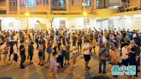 Tối 11/7, người dân Hồng Kông xếp hàng dài bên ngoài trạm bỏ phiếu Tin Shui Estate tở Tin Shui Wai. (Ảnh: Vũ Tinh / Vision Times).