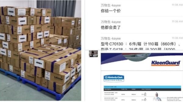 Ngày 23/3, tài khoản Wechat “@西雅图雷尼尔” (nghĩa là Seattle Rainier) đăng hình ảnh đoạn trò chuyện trong nhóm “Kết nối vật tư y tế nước Mỹ”. Đoạn đối thoại này rao bán 2.000 bộ đồ bảo hộ là hàng cứu trợ được chuyển từ Mỹ về Trung Quốc, trên thùng còn có hàng chữ “Trung Quốc cố lên”. Đem hàng cứu trợ từ Mỹ chuyển về, để bán lại qua phía Mỹ, điều này làm dấy lên sự phẫn nộ trong cộng đồng, và nhiều tài khoản chat khác cũng tố cáo các trường hợp cơ quan chức năng Trung Quốc bán hàng được nhận cứu trợ tương tự.