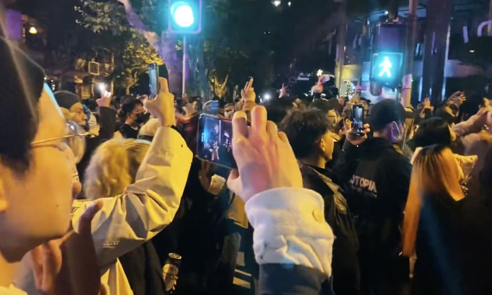 “Dỡ phong tỏa Urumqi! Dỡ phong tỏa Tân Cương! Dỡ phong tỏa Trung Quốc!” đám đông hét to ở Thượng Hải, theo một đoạn video được lan truyền trên mạng xã hội.