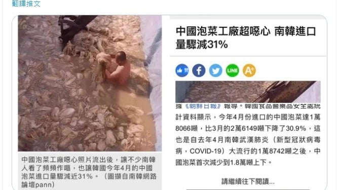 Bức ảnh cho thấy bể kim chi dơ bẩn ngập tràn bắp cải, gầu xúc của một chiếc xe xúc đang khuấy đảo, và kinh khủng hơn là cảnh người đàn ông ngực trần đang đứng trong bể làm việc. Có thông tin cho rằng đây là hình ảnh từ video của một nhà máy sản xuất kim chi ở tỉnh Tứ Xuyên, Trung Quốc.