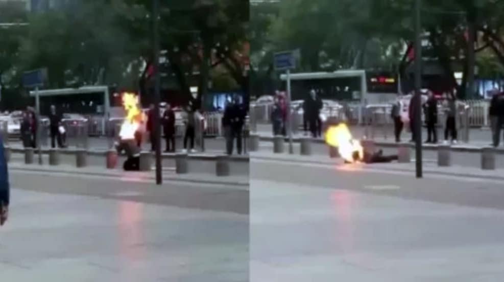 Đoạn video lưu hành trên Internet cho thấy, người đàn ông mặc quần áo khá dày này đột nhiên toàn thân bốc cháy, sau đó ngã gục xuống đất. Không có bất kỳ ai tiến lại gần để giúp anh ta dập tắt lửa, người xem chỉ lặng lẽ đứng quan sát từ xa.