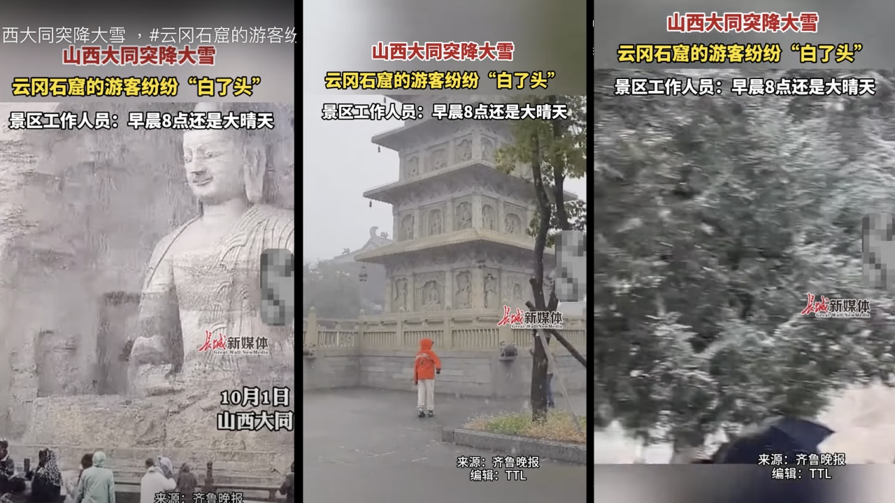 Jimu News đưa tin, hôm 1/10, một trận tuyết lớn bất ngờ xảy ra ở Đại Đồng, tỉnh Sơn Tây, khách du lịch tại Hang động Vân Cương trở nên “trắng đầu”. Trang Tin Thời tiết Trung Quốc cho biết, khoảng 10:00 ngày 1/10, tại Đại Đồng xảy ra mưa, nhiệt độ giảm xuống 0,3 độ C, gần đạt điểm đóng băng và giai đoạn mưa chuyển sang trạng thái mưa tuyết.