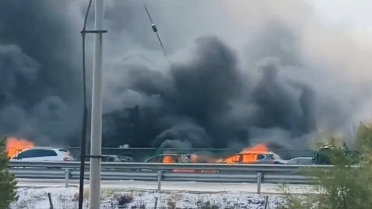 Theo video, nhiều xe ô tô đã tông vào nhau, xe bị lửa thiêu cháy khói bốc lên cuồn cuộn bao phủ bầu trời, có thể nhìn thấy cách đó vài km. Một số ô tô bị cháy rụi đến mức chỉ còn lại khung, các mảnh vỡ vương vãi khắp mặt đất.