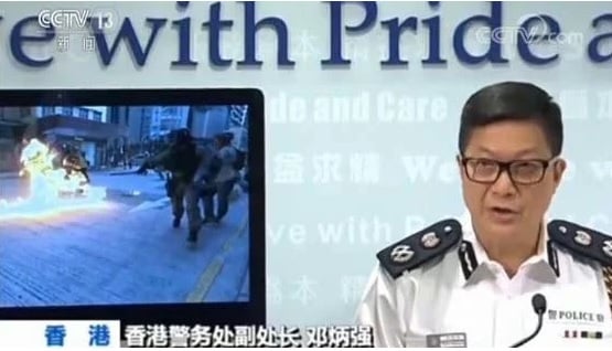 Đến ngày 13/8, CCTV đã đưa lại thông tin liên quan và dẫn lời ông Đặng Bính Cường, Phó giám đốc Cảnh sát Hồng Kông, phát biểu trong buổi họp báo vào ngày 12/8. Ông Đặng khẳng định người biểu tình đã ném bom xăng vào đồn cảnh sát Tsim Sha Tsui khiến một cảnh sát bị cháy hai chân, gây bỏng chân cấp 2. Khi CCTV đưa tin đã dùng lại hình ảnh trong Weibo lúc trước.