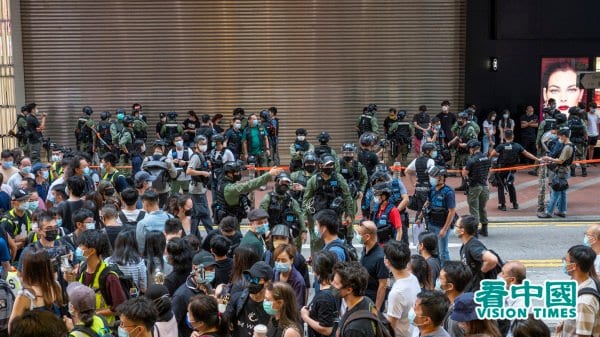 Ngay cả khi không hô khẩu hiệu được coi là “vi phạm lệnh cấm”, người dân vẫn sẽ bị cảnh sát trấn áp ngay lập tức khi muốn biểu đạt bất kỳ yêu cầu nào, và trưng bày các tài liệu và biểu ngữ cũng bị cấm. Một số người dân để xuống đất một máy phát thanh để phát bài hát “Nguyện vinh quang quy Hương Cảng” và cùng nhau hát. Cảnh sát chống bạo động đã giương cao lá cờ tím và dẫm nát máy phát thanh. Một số người dân giơ khẩu hiệu với dòng chữ “Cách mạng không có tội và nổi dậy là chính đáng” về phía cảnh sát và cũng bị cảnh sát xua đuổi giải tán.