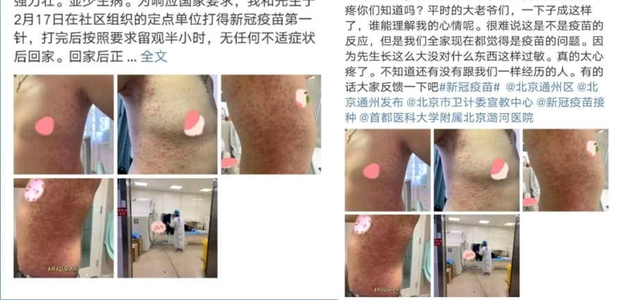 Ngày 1/3, một tài khoản Weibo Đại Lục có tên “Vĩnh viễn bảo vệ Phúc Phi của bạn” đã đăng bài tiết lộ một số phản ứng nghiêm trọng sau khi chồng cô được tiêm vắc-xin corona mới. Trong bài viết, trước tiên cô khẳng định vợ chồng cô không bị dị ứng và chưa từng có phản ứng dị ứng với bất cứ thứ gì trong quá khứ. Ngày 17/2, vợ chồng cô được tiêm mũi vắc-xin virus Vũ Hán đầu tiên, tại một đơn vị được chỉ định của khu dân cư. Sau khi tiêm, hai người ở lại theo dõi nửa tiếng theo yêu cầu và về nhà mà không có biểu hiện gì.