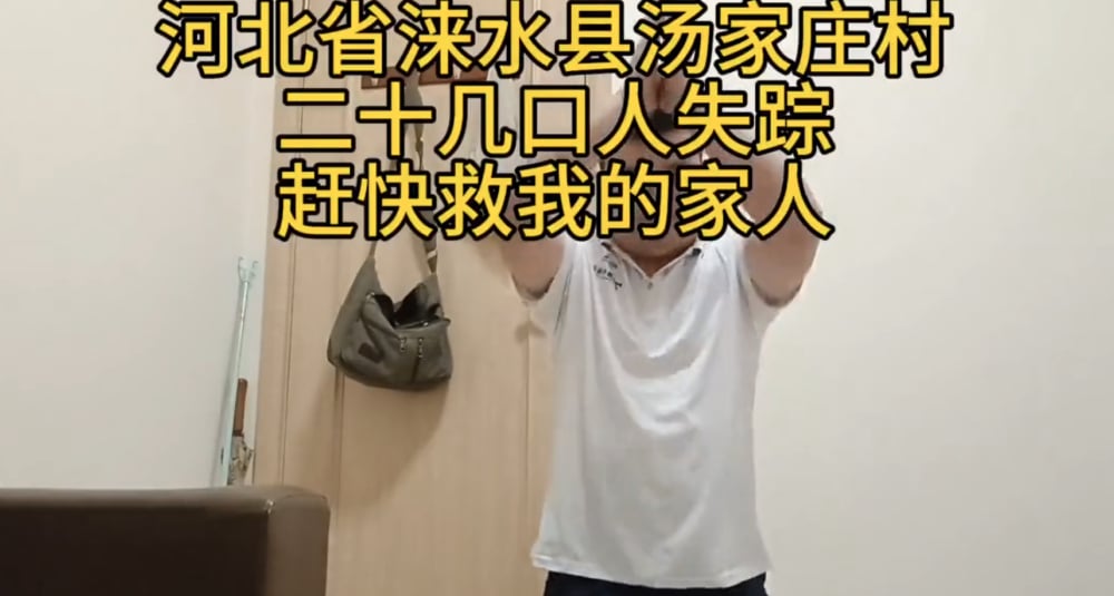 Trong một video do tài khoản Twitter “@chvideonews” đăng hôm 4/8, một người đàn ông trung niên đã quỳ xuống và cầu xin sự giúp đỡ, ông cho biết, trận lụt 100 năm hiếm có ở Hà Bắc đã ảnh hưởng đến quê nhà của ông – Thang Gia Thôn (thị trấn Triệu Trang, huyện Lai Thủy, tỉnh Hà Bắc). Hơn 20 thành viên trong gia đình đã biến mất, và những người sống sót cũng không biết tình hình của họ hiện giờ ra sao. Những người còn lại trong làng đều là những người đã trông ông lớn lên.