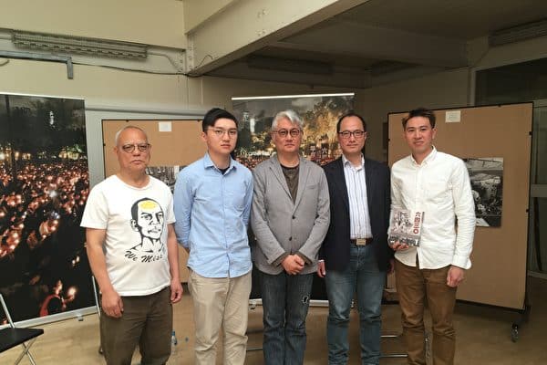Từ phải qua: Người chủ trì Diễn đàn Lục Tứ là cựu Ủy viên Hội đồng quận Sa Điền - ông Khâu Văn Tuấn; cựu Giám đốc Cục Khảo thí và Đánh giá Hồng Kông, Dương Dĩnh Vũ (đứng thứ 2); cựu Trợ lý giáo sư chính trị và quan hệ quốc tế Đại học Baptist, Hoàng Vĩ Quốc (đứng giữa, thứ 3 từ phải sang trái); cựu Chủ tịch Đảng Demosistō Hồng Kông, Trịnh Gia Lãng (đứng thứ tư), nhà hoạt động ủng hộ dân chủ Ngô Lữ Nam (đứng thứ 5 bên trái). (Ảnh: Lin Yishan / Epoch Times)