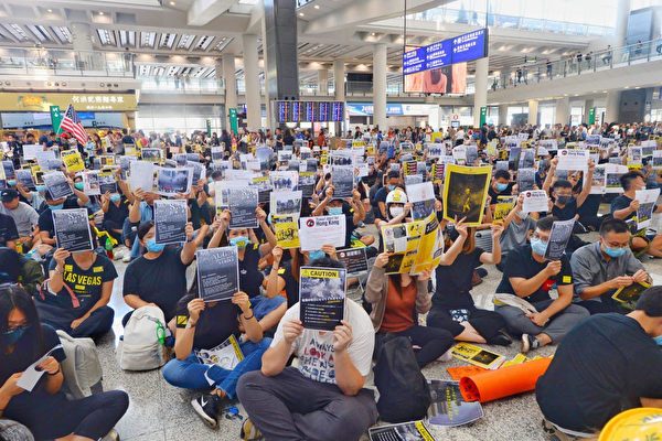 Cửa ra A, B của Sảnh T1 của sân bay quốc tế Hồng Kông đã bị người biểu tình là sinh viên và người dân Hồng Kông ngồi kín. Tại lối ra của hành khách và lối đi của sảnh sân bay, các sinh viên xếp hàng ngang để phát các tờ rơi, nói cho du khách đến Hồng Kông biết nơi đây đang xảy ra việc gì.