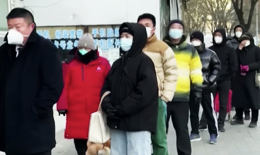 Xếp hàng dài chờ trước cửa nhà thuốc ở Bắc Kinh. (Ảnh cắt từ video)