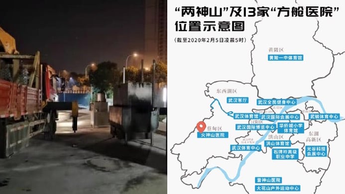 Theo Nhật báo Trường Giang tại Trung Quốc đưa tin, chính quyền Trung Quốc lần lượt dựng hai bệnh viện là Hỏa Thần Sơn và Lôi Thần Sơn, nhưng ước tính vẫn chưa đủ để sử dụng, do đó đến ngày 4/2, sẽ xây dựng các “bệnh viện container” ở một số nơi như Trung tâm Triển lãm quốc tế Vũ Hán (1.000 giường bệnh), Nhà thể thao Hồng Sơn Vũ Hán (800 giường bệnh), Nhà khách Vũ Hán (2.000 giường bệnh).