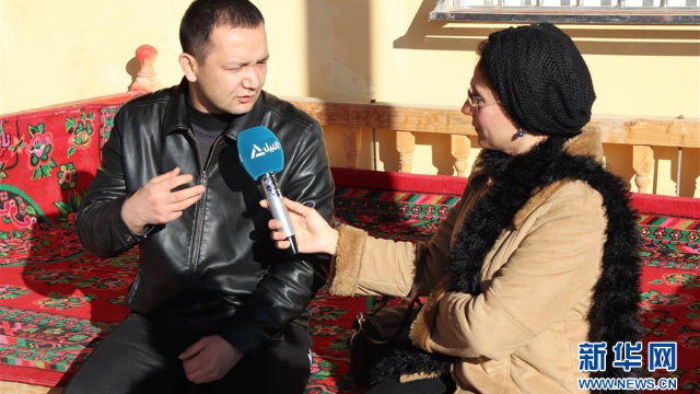 Một phóng viên đài truyền hình Nile đang phỏng vấn một người trong làng vừa mới được thả tự do khỏi trại cải cạo Tân cương. Nguồn: Tân Hoa Xã.