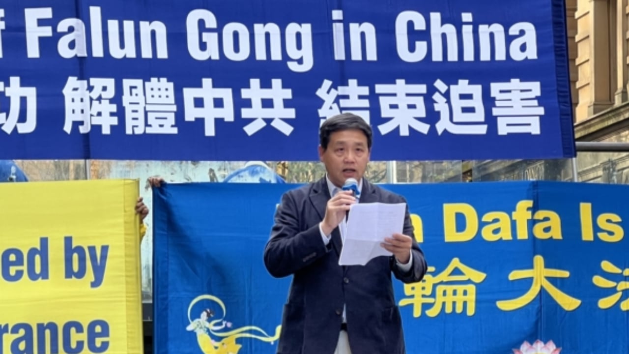 Ông Lý Nguyên Hoa, một nhà sử học sống ở Úc, tham gia một cuộc mít tinh nhằm chấm dứt cuộc đàn áp Pháp Luân Công của Đảng Cộng sản Trung Quốc (ĐCSTQ) trước Tòa nhà Quốc hội ở thủ đô Úc vào tháng 7/2024. (Ảnh: Viên Lệ /The Epoch Times)