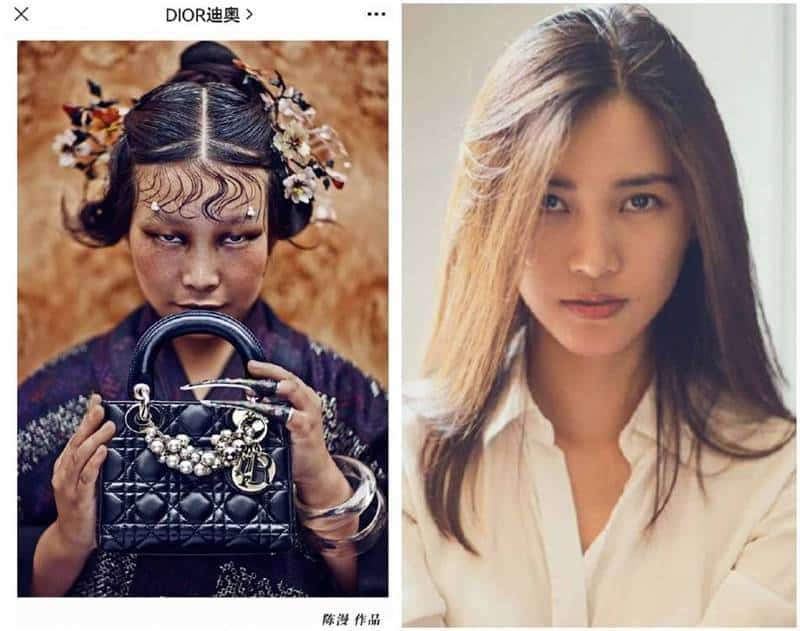 Bên trái là bức ảnh quảng cáo xúc phạm Trung Quốc của Dior, bên phải là nhiếp ảnh gia Trần Mạn (Ảnh: Weibo)