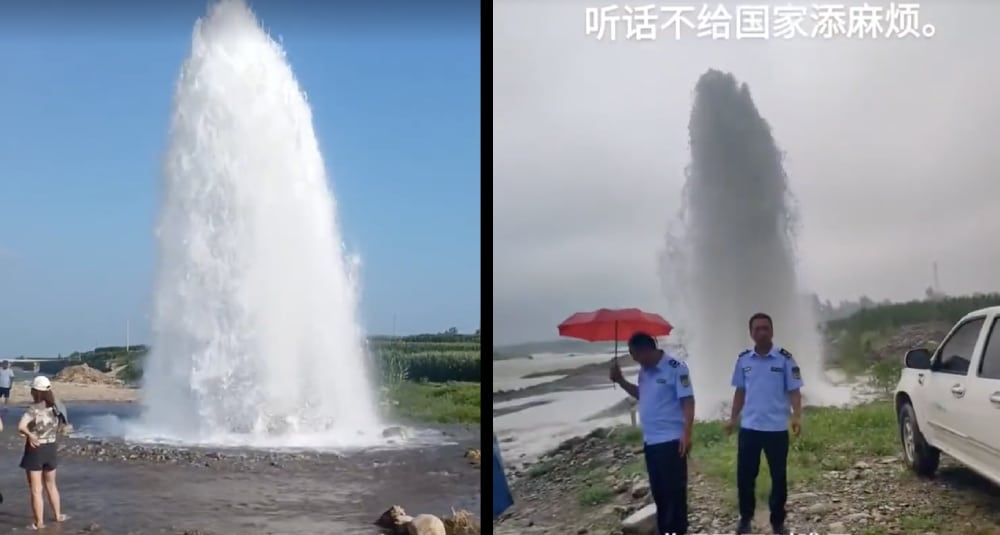 Ngoài ra, hiện tượng phun nước cũng xảy ra ở Hùng An, tỉnh Hà Bắc. Video trên mạng cho thấy vào ngày 8/8, sau trận mưa lớn, con sông ở Hùng An này liên tiếp phun nước trong 3 ngày, chưa rõ nguyên nhân.