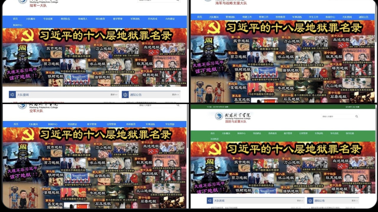 Ngày 2/10, trên trang web của Học viện Nghề Vũ Xương bất ngờ xuất hiện hình ảnh “Hồ sơ tội ác 18 tầng địa ngục của Tập Cận Bình”. Học viện này là một cơ sở chuyên đào tạo sĩ quan cho Lục quân, Hải quân, Không quân, Lực lượng Tên lửa, Lực lượng Cảnh sát Vũ trang và Cục Huy động Quốc phòng của Quân ủy Đảng Cộng sản Trung Quốc (ĐCSTQ). Hình ảnh này cũng đồng thời xuất hiện trên trang web chính thức của Cơ sở Giáo dục Quốc phòng Nam Dương, Đại học Kỹ thuật Hải quân của Trung Quốc, thậm chí cả trang web chính thức “Thẻ công dân thành phố Hàm Đan” của Hà Bắc.