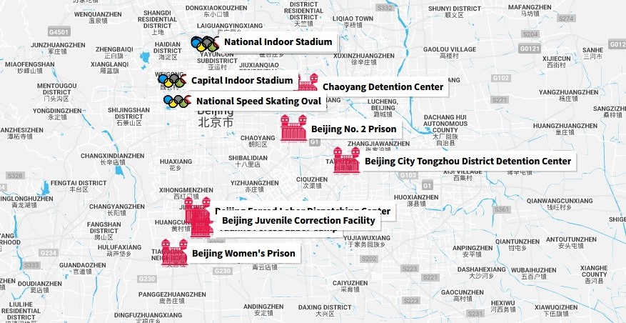 Một số “điểm nóng” gần nhất có thể liệt kê như: Trung tâm giam giữ Triều Dương, cách Sân vận động Quốc gia 16km; Trung tâm phân phối lao động cưỡng bức Bắc Kinh, cách Sân vận động Trượt băng Quốc gia 19km; Trại lao động cưỡng bức Đoàn Hà Bắc Kinh, cách Sân vận động Trượt băng Quốc gia 19km…