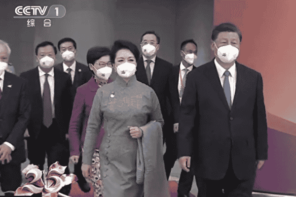 Ngày 30/6/2022 lãnh đạo ĐCSTQ Tập Cận Bình và phu nhân Bành Lệ Viện đã đến Hồng Kông bằng đường sắt cao tốc. Hình ảnh họ đeo khẩu trang khi rời nhà ga (Ảnh chụp màn hình video).