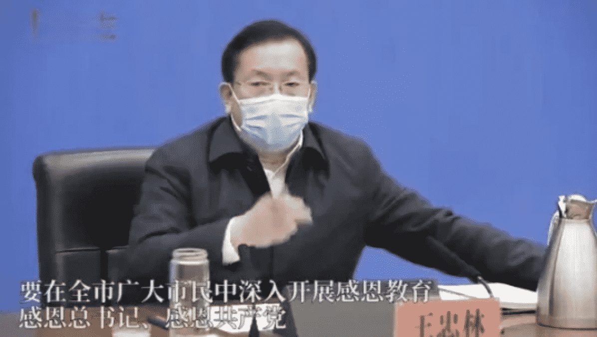 Kênh truyền thông tỉnh Hồ Bắc công bố: Tối ngày 6/3, trong cuộc họp online của Bộ Chỉ huy Phòng ngừa Dịch Viêm phổi corona mới của Đảng ủy thành phố Vũ Hán, ông Vương Trung Lâm chỉ đạo: Cần triển khai sâu rộng việc giáo dục lòng biết ơn của quảng đại cư dân toàn thành phố, biết ơn Tổng Bí thư (Tập Cận Bình), biết ơn Đảng Cộng sản Trung Quốc (ĐCSTQ).