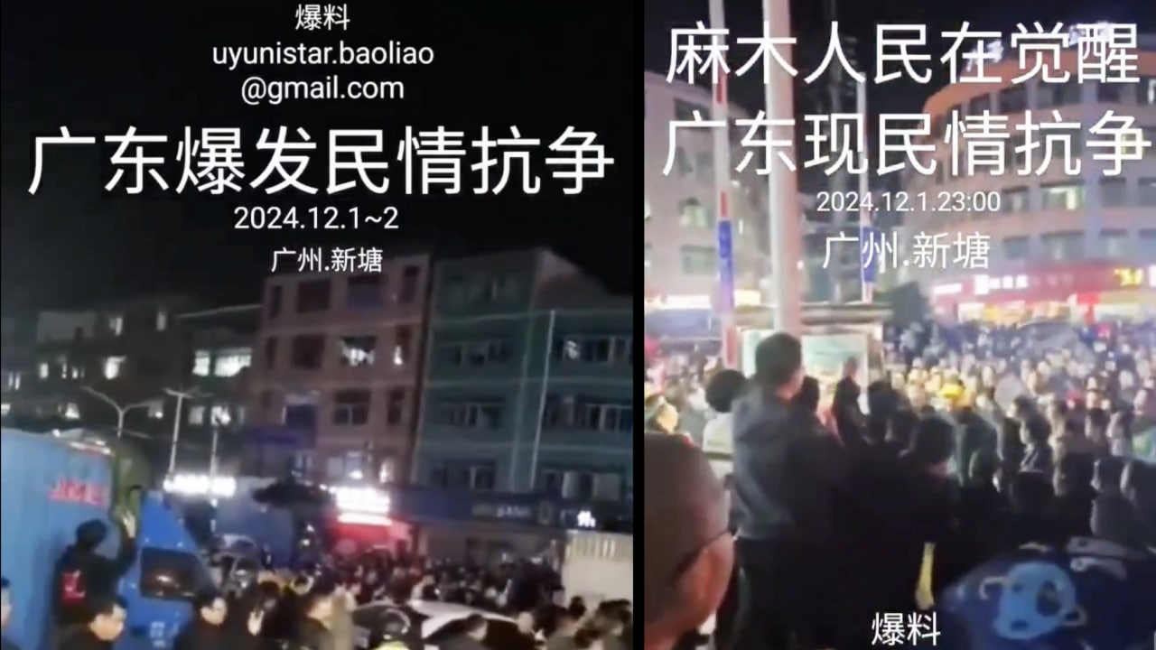 Theo thông tin lan truyền trên mạng, đêm khuya ngày 1/12, tại làng Đại Đôn, thị trấn Tân Đường, quận Tăng Thành, Tp. Quảng Châu, tỉnh Quảng Đông, Trung Quốc, xảy ra vụ biểu tình phản kháng tập thể. Chính quyền muốn quây làng lại để thiết lập các trạm kiểm soát nhằm thu phí ra vào, điều này đã gây ra sự phản kháng mạnh mẽ từ những người thuê nhà và một trạm thu phí đã bị đập phá. Chính quyền đã triển khai lực lượng cảnh sát đông đảo để trấn áp.