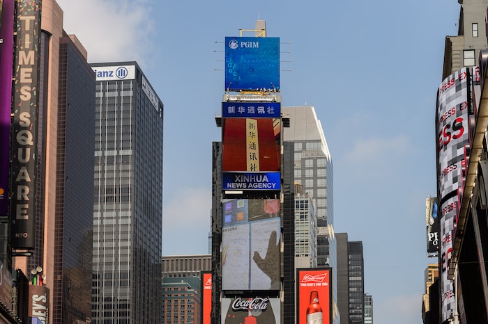 Biển quảng cáo khổng lồ của Tân Hoa Xã đặt gần Quảng trường Thời Đại ở New York (Ảnh từ Getty Images)
