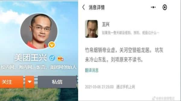 Ngày 18/6, tờ Bloomberg News đưa tin, Chủ tịch Hội đồng quản trị kiêm Giám đốc điều hành của Meituan là ông Vương Hưng từng đăng một bài thơ Đường lên mạng xã hội vào tháng trước, dẫn đến làn sóng lớn khiến giá cổ phiếu của Meituan giảm mạnh. Chính quyền Bắc Kinh đã ra lệnh cho ông giữ im lặng.