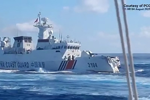 Một vụ va chạm gần bãi cạn Scarborough giữa tàu hải cảnh 3104, tàu chiến Quế Lâm (Guilin) của Trung Quốc và một tàu tuần tra của Philippines. Mặc dù không có phát súng nào được bắn ra, tàu Cảnh sát biển Trung Quốc đã va chạm với chính tàu của mình. Video từ Philippines cho thấy tàu 3104 liên tục truy đuổi tàu Cảnh sát biển Philippines, khi tàu Guilin bất ngờ cắt ngang và đi qua giữa tàu Philippines và tàu 3104. Tàu Philippines đã tránh được tai nạn, trong khi mũi tàu 3104 đâm vào thân tàu Guilin.Ngày 11/8/2025, cảnh sát biển Philippines công bố hình ảnh cho thấy mũi một tàu hải cảnh Trung Quốc bị hư hỏng nặng do va chạm với một tàu hải quân Trung Quốc khi đang truy đuổi tàu tuần tra của Philippines ở khu vực bãi cạn Scarborough. (Ảnh do Cảnh sát biển Philippines cung cấp)