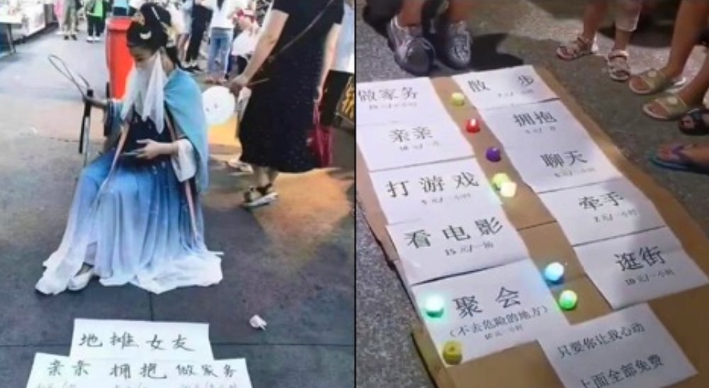 Hình ảnh trong tweet cho thấy trên một con đường nhỏ được cho là ở khu trung tâm thành phố có rất nhiều người đi bộ qua lại, một cô gái mặc bộ váy xinh đẹp đang ngồi trên ghế. Trên mặt đất bên cạnh cô là các tờ giấy trắng, trên đó viết “Bạn gái đường phố“: 5 tệ cho một lần ôm, 10 tệ cho một lần hôn, 20 tệ cho nửa giờ làm việc nhà; nắm tay, trò chuyện, dạo phố lần lượt 10 tệ mỗi giờ; còn ăn cơm thì người mời trả tiền, v.v.