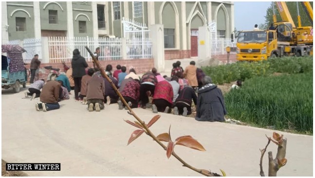 Các thành viên hội Thánh đã cầu nguyện trong nước mắt khi Thánh giá của một nhà thờ Tam tự ở thị trấn Ngô Giang thuộc huyện Dĩnh Đông thành phố Phụ Dương bị dỡ bỏ.