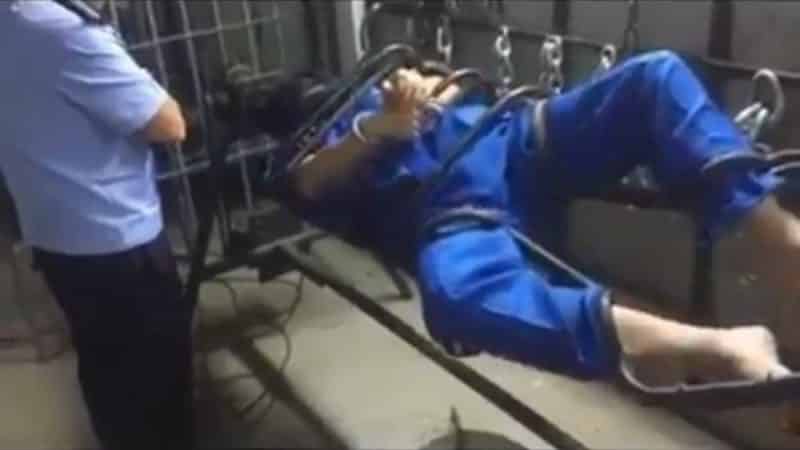 Trong video có thể thấy người Tân Cương mặc áo tù màu xanh bị trói trên dụng cụ tra tấn, và đứng bên là một viên cảnh sát đang tra hỏi, còn có một cảnh sát khác điều khiển dụng cụ tra tấn.