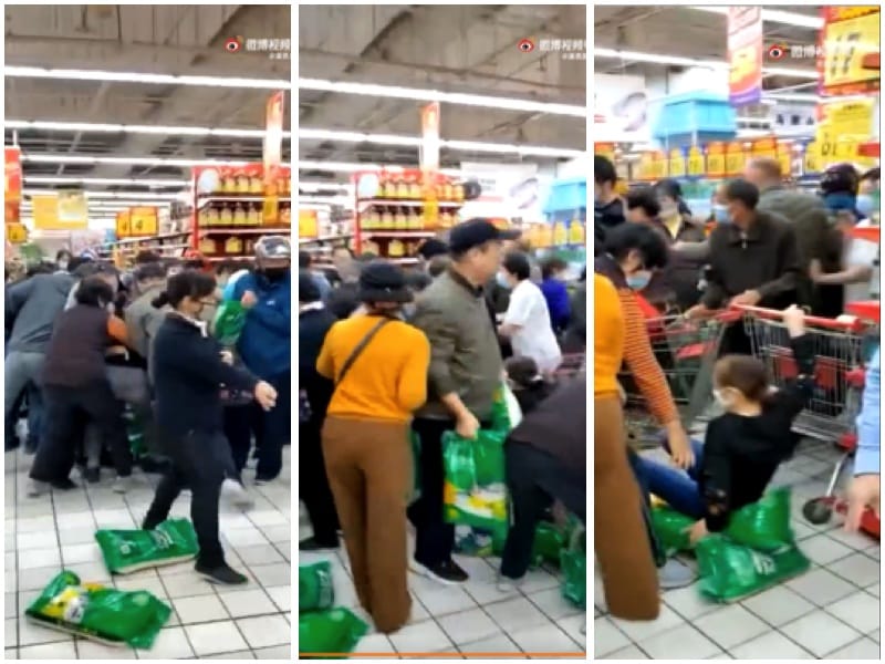 Tại Trung Quốc Đại Lục, nhiều đoạn video cho thấy một số lượng lớn người dân bỏ nhiều bao gạo vào xe hàng của họ. Có người dân đã mua một lúc 300 kg gạo. Nhiều kệ hàng siêu thị đã được bán sạch trơn. Có người đã bị xô ngã xuống sàn vì việc tranh giành mua gạo.
