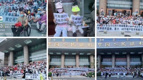 Vào ngày 10/7, hơn 3.000 người gửi tiền đã tập trung bên ngoài chi nhánh Trịnh Châu của Ngân hàng Nhân dân Trung Quốc để bảo vệ quyền lợi của mình, kết quả là họ đã bị cảnh sát bao vây và và những người không rõ danh tính đánh đập. (Ảnh chụp màn hình video)