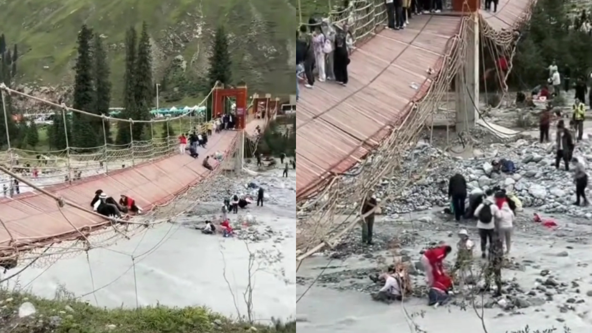 新疆一景区网红桥绳索断裂,多名游客坠落湍急河流!8月6日,新疆伊犁夏塔昭苏县夏塔旅游风景区,将军桥绳索断裂,导致桥面严重倾斜,一些正在桥上行走的游客落入河中,有游客摔伤,还有人被冲到下游。据悉,该桥去年也6月曾发生倾斜事故。 pic.twitter.com/zoCbzfXGsz