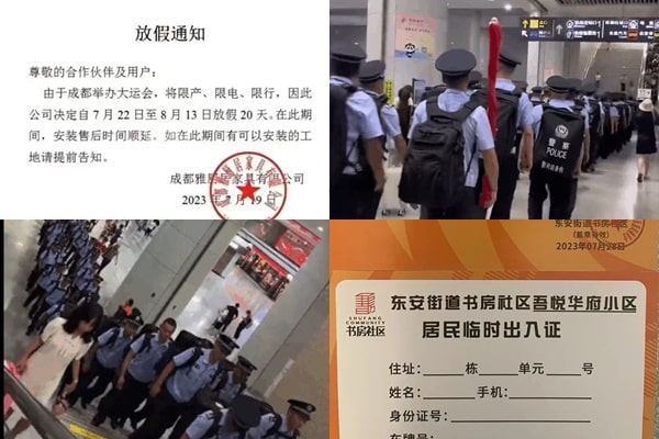 Đại hội Thể thao Sinh viên Thế giới Mùa hè lần thứ 31 đã khai mạc tại Thành Đô vào ngày 28/7. Người dân ở Thành Đô nói với Epoch Times vào ngày 27/7 rằng chính quyền ‘sợ bóng sợ gió’, nâng cấp duy trì ổn định, phòng bị nghiêm ngặt, yêu cầu rất nhiều doanh nghiệp sản xuất dừng hoạt động, đồng thời thực hiện nghiêm ngặt việc quản lý giao thông. Điều này đã ảnh hưởng đến cuộc sống bình thường của người dân.