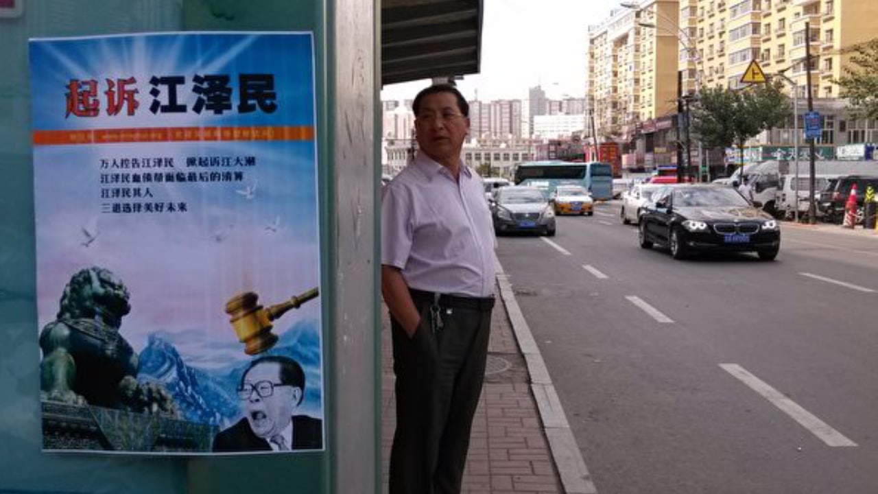 Áp phích tố cáo Giang Trạch Dân trên đường phố tỉnh Cát Lâm, Trung Quốc Đại Lục. (Ảnh: Minghui.org)
