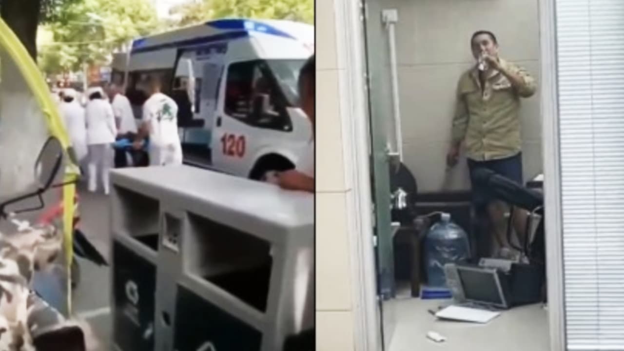 Một cảnh khác cho thấy, nhân viên y tế đẩy một người bị thương có vết máu lớn trên người lên xe cứu thương 120. Tại hiện trường có cảnh sát cầm khiên.