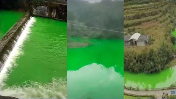 Nước ở thượng nguồn sông Dã Miêu (Yemao) ở thị trấn huyện Hàm Phong, n Thi, Hồ Bắc đã chuyển sang màu xanh lục, được cho là không độc hại (nguồn ảnh: Weibo).