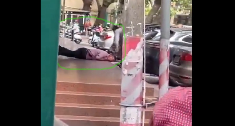 Trong video, một người đàn ông mặc đồ hồng bị đánh ngã xuống đất trước phường Ái Quốc, quận Hà Sơn, người đàn ông mặc đồ trắng vung cuốc đánh vào người ông ấy.