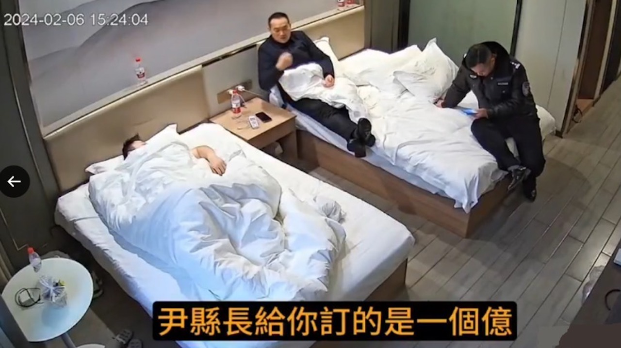 Đoạn video cho thấy trong phòng có 2 chiếc giường lớn, bên trái giường có một người đàn ông đắp chăn bông. Một người đàn ông trông có vẻ là quan chức lãnh đạo đang ngồi trên giường bên phải, cạnh giường có một viên công an đang lướt điện thoại.