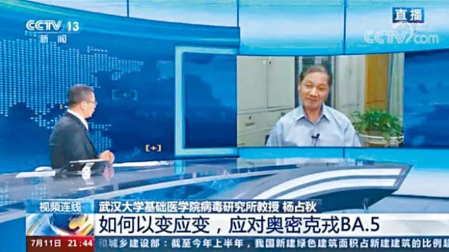 Vào ngày 11/7, ông Dương Chiêm Thu, Phó giám đốc Viện virus, Khoa Y Đại học Vũ Hán, đã chỉ ra trong một cuộc phỏng vấn với chương trình “Tin tức 1 + 1″ của CCTV, rằng hầu hết các bệnh nhân bị nhiễm virus Omicron BA.5 đều là lây nhiễm không triệu chứng, việc lây nhiễm này có thể chỉ được phát hiện sau khi tiến hành xét nghiệm. Mức độ gây hại do BA.5 gây ra đã giảm đáng kể. Trước đây, người ta tin rằng virus viêm phổi Vũ Hán chủ yếu gây tổn thương phổi, nhưng hiện tại, virus biến thể Omicron chỉ lây nhiễm ở cổ họng và đường hô hấp trên, tức là nó có các triệu chứng tương tự như cảm lạnh, và không gây ra viêm phổi.
