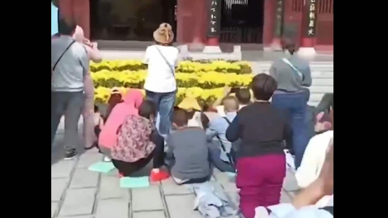 Một nhân viên bảo vệ nhanh chóng tiến tới vừa hét “đứng dậy”, “đứng dậy”, vừa dùng vũ lực kéo những du khách đang quỳ đứng dậy. Nhân viên bảo vệ ở lối vào đại đường cũng thô lỗ hét lên: “Đứng dậy! Không được phép quỳ!”