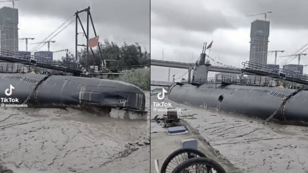 Từ ngày 2/8, một video được cộng đồng mạng Trung Quốc chia sẻ cho thấy một chiếc tàu ngầm phủ đầy bùn vàng trên sông bị lũ cuốn vào bờ và mắc cạn.