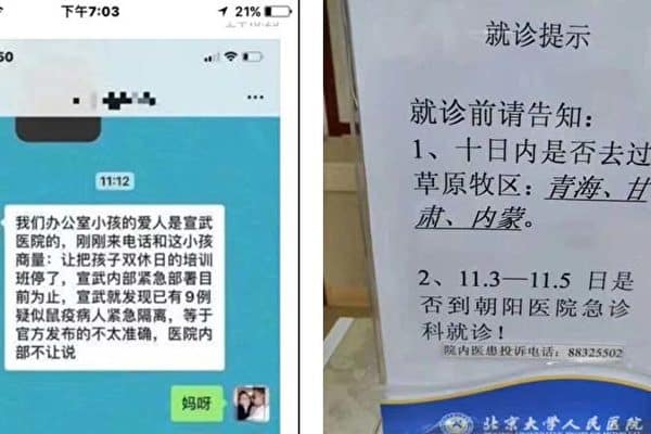 Ngày 12/11, chính quyền Bắc Kinh thông báo, hai người đến từ Nội Mông Cổ tại bệnh viện Triều Dương Bắc Kinh được chẩn đoán chính xác mắc dịch hạch. Thông tin này đã khiến người dân hoang mang. Chính quyền và bệnh viện sau đó cật lực ngăn chặn thông tin nhưng cư dân mạng địa phương lan truyền nhanh chóng, nhiều người trong giới y tế và người nắm được tình hình cũng đang lan truyền nội tình liên quan.