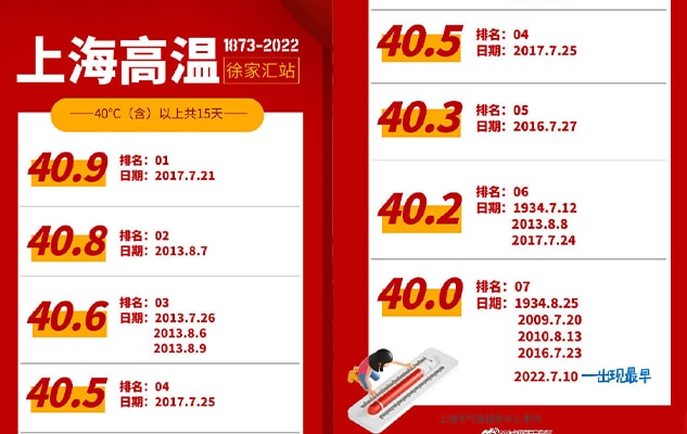 Theo tin tức do cơ quan chức năng thời tiết Trung Quốc công bố vào ngày 13/7, vào lúc 14:30 hôm 13/7 nhiệt độ tại ga Từ Gia Hối (Xujiahui) – Thượng Hải đạt tới 40,9°C, đánh dấu kỷ lục nhiệt độ cao nhất kể từ năm 1873 khi Thượng Hải có hồ sơ khí tượng.