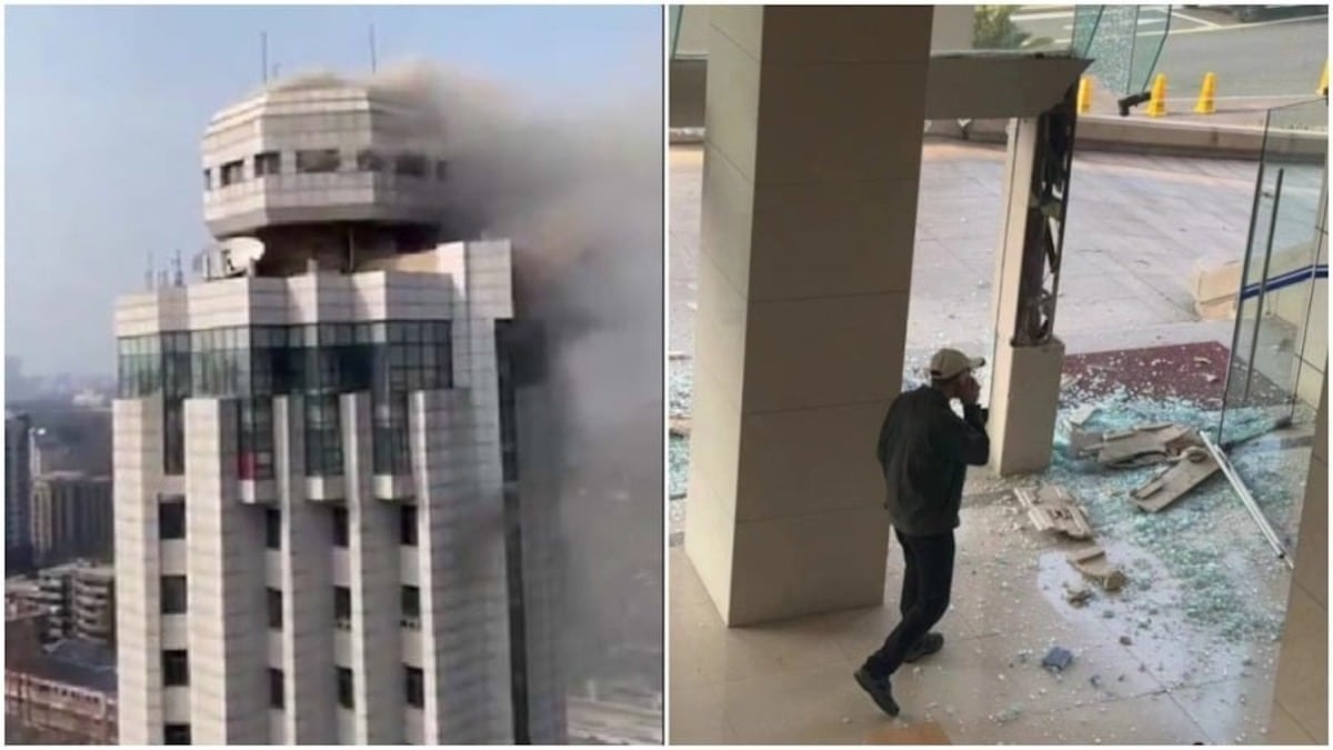 Tòa nhà chính quyền thành phố Trương Gia Cảng bị đánh bom (Ảnh cắt từ video)