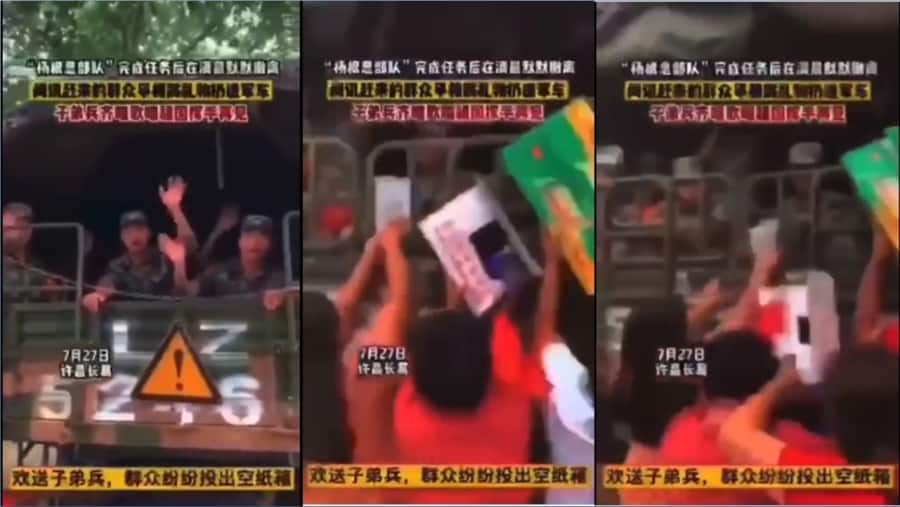 Ngày 30/7, trên mạng xã hội Twitter lan truyền một đoạn video, nội dung cho thấy vào ngày 27/7, một đơn vị quân đội ở thành phố Trường Cát (thuộc thành phố Hứa Xương, tỉnh Hà Nam) sau khi hoàn thành nhiệm vụ đã âm thầm rút đi. Đám đông “quần chúng” sau khi nghe tin đã vội vã đến, tay cầm cờ nhỏ và “quà” chạy theo ném “quà” lên xe quân sự. Quân nhân trên xe đẩy lại có ý từ chối không nhận. Tuy nhiên, màn kịch “quân với dân như cá với nước” này vô tình diễn hơi quá lố, một trong những “hộp quà” bị bung ra trong lúc ném lên xe cho thấy bên trong trống rỗng.