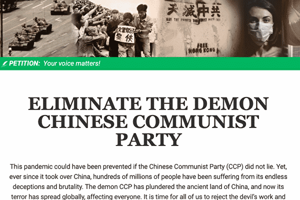 Trên trang web “Kết thúc ĐCSTQ” (endccp.com) có đoạn viết: “Đại dịch này đã có thể tránh được nếu ĐCSTQ không nói dối. Tuy nhiên, kể từ khi chiếm được Trung Quốc, hàng trăm triệu người đã phải chịu đựng sự lừa dối và tàn bạo bất tận của đảng. “Quái vật ĐCSTQ” đã cướp bóc vùng đất cổ xưa Trung Hoa, và bây giờ khủng bố của nó đang lan ra toàn cầu, ảnh hưởng đến mọi người. Giờ là lúc tất cả mọi người cự tuyệt Trung Cộng ác ma và kết thúc ĐCSTQ.”