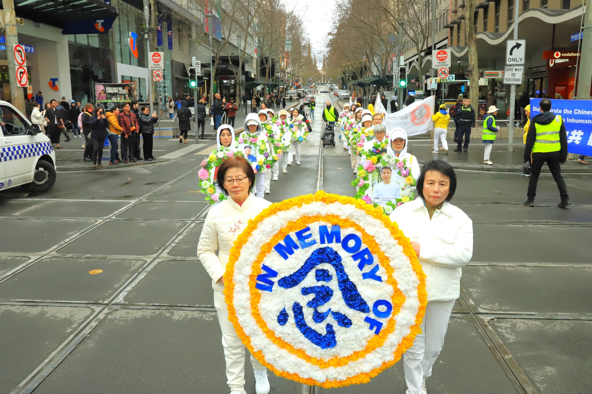 Vào ngày 20/7/2024, một số học viên Pháp Luân Công ở Melbourne đã tổ chức tuần hành phản bức hại ở trung tâm thành phố. (Ảnh: Grace Yu / Epoch Times)