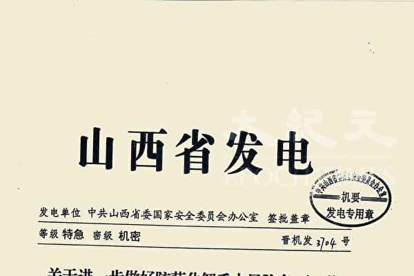 Theo tờ Epoch Times (Mỹ) cho biết, họ nhận được một công văn cơ mật, loại đặc biệt của Văn phòng Ủy ban An ninh Quốc gia tỉnh Sơn Tây ra ngày 2/9/2019. Công văn cho biết, tỉnh Sơn Tây là lá chắn bên cạnh quan trọng bảo vệ thủ đô Bắc Kinh, bắt đầu từ tháng Chín các ban ngành trong toàn tỉnh bước vào “trạng thái chuẩn bị chiến tranh”, phải canh phòng 24/24.