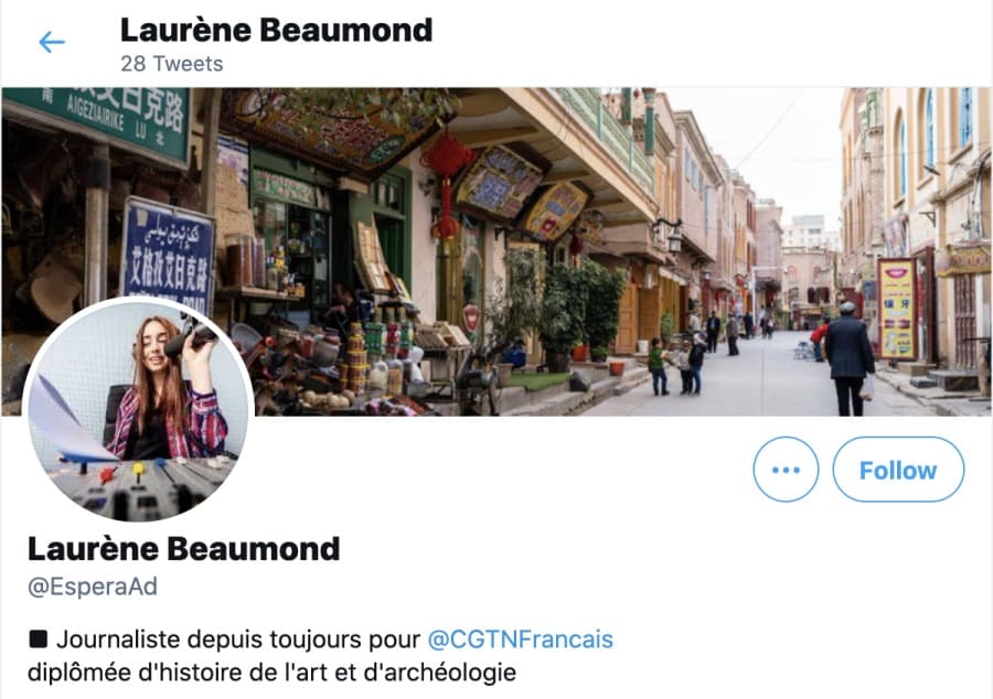Ngày 28/3, trang web tiếng Pháp thuộc Mạng lưới Truyền hình Toàn cầu Trung Quốc (CGTN) đã đăng bài viết của bà Laurène Beaumond, một “nhà báo độc lập” người Pháp. Tác giả bài báo tự mô tả mình là một người Pháp đã sống ở Trung Quốc 7 năm và tuyên bố rằng trong khoảng thời gian từ năm 2014 đến năm 2019 bà ấy từng nhiều lần đến thăm Tân Cương, và còn có người thân sống ở Urumqi. Bà Beaumond tuyên bố rằng mô tả về Tân Cương của các kênh truyền thông Pháp hoàn toàn không giống với những gì bà tự mình mắt thấy tai nghe.